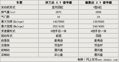國(guó)產(chǎn)漢蘭達(dá)和新勝達(dá)的排量均為2.7這個(gè)區(qū)間,但是在發(fā)動(dòng)機(jī)形式和技術(shù)上卻存在著本質(zhì)區(qū)別。漢蘭達(dá)的引擎為直列四缸,該發(fā)動(dòng)機(jī)配備了雙VVT-i技術(shù),實(shí)現(xiàn)了卓越的動(dòng)力輸出,同時(shí)進(jìn)一步提高了燃油經(jīng)濟(jì)性。新勝達(dá)則配備的是動(dòng)力輸出更加平穩(wěn)的V型6缸發(fā)動(dòng)機(jī)。兩款車(chē)型在動(dòng)力輸出上,漢蘭達(dá)占據(jù)了明顯優(yōu)勢(shì),這一點(diǎn)從動(dòng)力輸出上就可以明顯看出。比較遺憾的是漢蘭達(dá)2.7排量的車(chē)型都是前驅(qū),新勝達(dá)則是全時(shí)四驅(qū)。在變速器方面漢蘭達(dá)都配備的6檔手自一體變速器,新途勝則是4速手自一體變速箱。制動(dòng)方面兩款車(chē)型都是采用的前通風(fēng)盤(pán)后實(shí)心盤(pán)式的剎車(chē)。