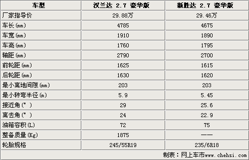 國(guó)產(chǎn)漢蘭達(dá)和現(xiàn)代新勝達(dá)均屬于一個(gè)級(jí)別的城市SUV車(chē)型,兩款車(chē)型均是2.7排量的高配車(chē)型,售價(jià)相差了4200元。在車(chē)身尺寸方面,國(guó)產(chǎn)漢蘭達(dá)在車(chē)長(zhǎng)、車(chē)寬、均超過(guò)了現(xiàn)代新勝達(dá),這一點(diǎn)保證了其內(nèi)部橫向空間及頭部空間的寬敞。在軸距方面,豐田漢蘭達(dá)比新勝達(dá)長(zhǎng)出了90mm,這一點(diǎn)意味著漢蘭達(dá)的腿部空間將會(huì)優(yōu)越于新勝達(dá)。兩款車(chē)型的離地空間都達(dá)到了203mm,確保了它們?cè)趶?fù)雜路面上的道路通過(guò)性。越野性能方面,國(guó)產(chǎn)漢蘭達(dá)要優(yōu)越于新勝達(dá),這點(diǎn)從接近角和離去角的數(shù)據(jù)就可以看出來(lái)。豐田漢蘭達(dá)的前后輪距和輪胎橫截面數(shù)據(jù)都要大于新勝達(dá),這表明在操控性能上漢蘭達(dá)將會(huì)略勝一籌。漢蘭達(dá)和新勝達(dá)的油箱均達(dá)到了75升上下,可以為其提供良好的續(xù)航能力。