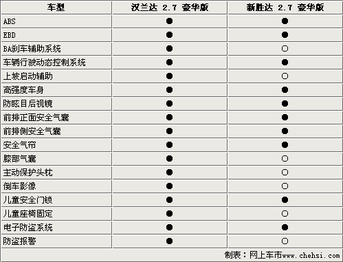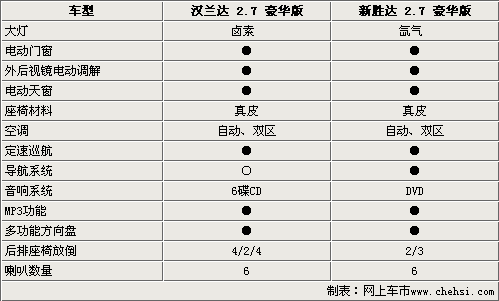 國產漢蘭達2.7豪華版和新勝達2.7豪華版的舒適配置可謂是應有盡有,電動天窗、真皮座椅、自動空調、定速巡航、多功能方向盤等設備都成為了標準配置。新勝達配備了導航系統和DVD影音系統,而漢蘭達豪華版的這兩項項配置均為選配。在后排放倒比例上,漢蘭達最為靈活多變,放倒比例達到了4:2:4,可以更加有效的方便乘客置放大件物品,新勝達后排座椅只可以按2:3的比例進行放倒。