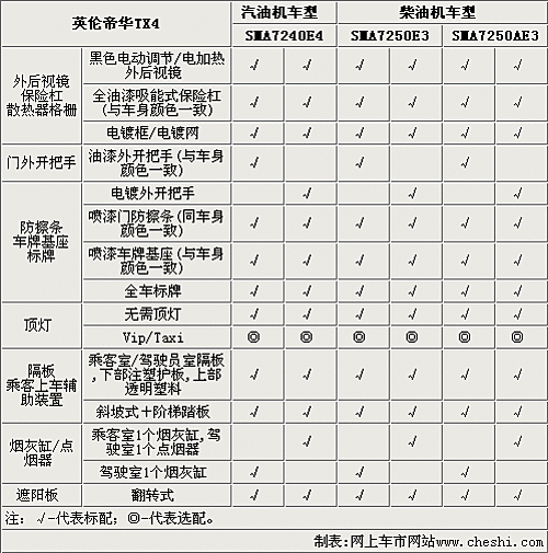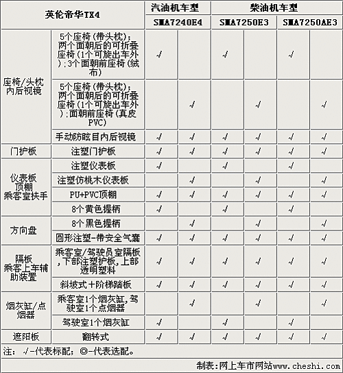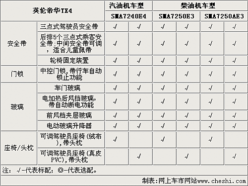 英倫TX4全系車型只配備手動空調,駕駛席和乘客席都配備照明燈,全系配備CD和收音機,而且乘客室可以選裝獨立音響控制。TX4的高配車型可以選裝MP3、GPS系統和倒車雷達。另外,這款車型的乘客室和駕駛席都配備了通訊設施,實用性更強。