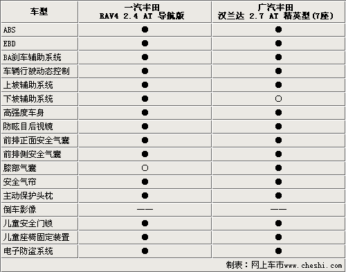 從上表我們可以看到,在電子主動安全系統的配備中,ABS+EBD、動態穩定系統和6安全氣囊均成為了一汽豐田RAV4 2.4自動導航版和廣汽豐田漢蘭達2.7精英型7座的標準配置。但仔細看下來它們還是略有不同。豐田RAV4再配備了上坡輔助系統的同時,還配備下坡輔助系統,確保車輛在斜坡上能以穩定速度的行駛。而漢蘭達則是配備了膝部氣囊,可以有效的降低事故發生后對乘客的傷害。比較遺憾的是這兩款車型均沒有配備倒車輔助系統。