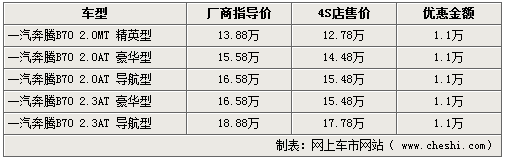 各家銷售人員均表示北京各個展廳內09款奔騰B70現車充足,現在購車的消費者將最高享受到1.1萬元現金優惠。據了解,此車型銷售較快的型號主要是2.0L的導航版車型,以及2.3L高配的兩款車型。