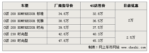 據4S店銷售人員介紹:目前奔馳C優惠幅度較大,全系購車送全險,同時C200K優惠達2萬元,C230、C280優惠更是達到2.5萬元。不過目前現車較少,有些車型需要預訂,預定周期為1個月左右。C200K優雅型與C230時尚型現車較少,C230時尚型甚至將要停產,由于這兩款車價格與其它3款車型價格相近,并配置有些令人不滿,所以將要停止生產。