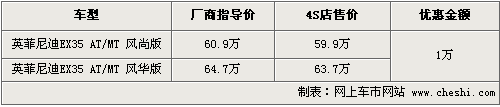 目前銷售的英菲尼迪EX35系列車型,最高可優惠現金1萬元,但是款式和顏色并不太齊全。英菲尼迪EX35車身顏色共有8種,分別是瑩貝白、水亮銀、櫻彩銀、海灣青、水銀灰、輝光藍、玻璃黑和秋楓粟。目前只有水亮銀有部分現車,其他均需要預訂。
