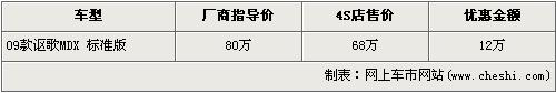 據(jù)經(jīng)銷商銷售人員介紹,09款謳歌-MDX的現(xiàn)金優(yōu)惠12萬元,優(yōu)惠后售價也從原廠商售價80萬降到了68萬,首次跌破了70萬元。銷售人員還介紹,09款謳歌MDX增加的實用性的配件包括前下護板和后下護板,能避免惡劣路況對底盤帶來的損傷,并且09款謳歌MDX還新增了巴厘海藍和摩卡褐金兩種顏色,店內(nèi)現(xiàn)車非常充足,顏色也比較全,欲購買者挑選的空間非常大。