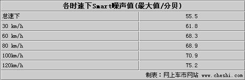 也許有人會擔(dān)心smart這么小的車隔音和密封性是否有問題,為此我們在北京北四環(huán)路中關(guān)村附近進行了測試,在車外我們測得了最高77分貝的環(huán)境噪聲;而當(dāng)我們進入到車內(nèi)噪聲指數(shù)立即下降了22分貝之多,55分貝的水平幾乎達到了辦公室的安靜程度。