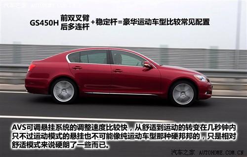GS450h上裝配的AVS適應(yīng)式可調(diào)懸掛系統(tǒng),可以自動(dòng)連續(xù)調(diào)整減震器的阻尼。當(dāng)然,也可以通過人工設(shè)置,分為普通和運(yùn)動(dòng)兩種狀態(tài)。普通模式下,懸掛和減震系統(tǒng)更多的顧及車內(nèi)舒適程度,偏軟的懸掛和松軟舒適的座椅讓駕駛員很難有想深踩油門的沖動(dòng),大部分的路感被懸掛系統(tǒng)吸收,傳進(jìn)車內(nèi)的只有少數(shù)幅度稍大一點(diǎn)的波動(dòng);運(yùn)動(dòng)模式下的懸掛系統(tǒng)表現(xiàn)得相對更敏感,對路面信息的傳遞也更清晰一些,但還談不上純正的運(yùn)動(dòng)車型的那種硬邦邦的懸掛調(diào)校,畢竟這不是那一類型的車。