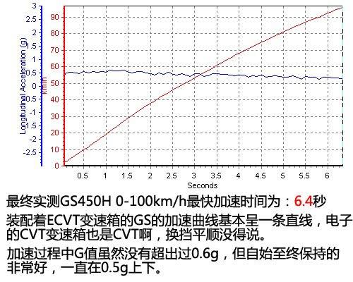 在加速測試環節,GS450h的表現讓我們都很驚訝,實測0-100km/h加速6.4秒的成績出乎所有人的意料,在日常駕駛階段雖然我們可以感覺到發動機的能力很強,但沒想到最終的測試成績竟然真的和官方給出的成績相差不多。