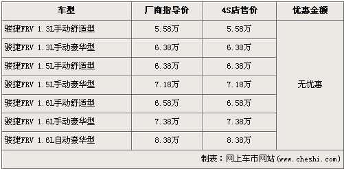駿捷FRV是中華汽車首款兩廂車型,排量分為1.6L和1.3L,兩種排量車型分別在去年5月份和7月份上市。近期,駿捷FRV的車型再次得到了豐富,1.5L車型已經(jīng)進(jìn)入各家中華經(jīng)銷店并開始售賣,駿捷FRV全系的售價(jià)區(qū)間為5.58萬元-8.38萬元。根據(jù)網(wǎng)上車市價(jià)格檢測系統(tǒng)顯示,駿捷FRV全系取消了現(xiàn)金優(yōu)惠,具體詳情請看下表: