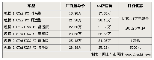 據4S店銷售人員介紹:目前邁騰最高優惠1.1萬元,再送1萬元裝飾套餐,其中包括9項升級,總計優惠可達2.1萬元。目前邁騰現車充足,銷量最大的黑色車現車較多,并且邁騰全系均可享受1萬元“大禮包”活動,但2.0Tsi車型優惠幅度較小,建議購買1.8Tsi車型。