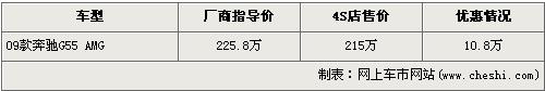 根據北京奔馳4S店銷售人員介紹,奔馳G55 AMG近期有10.8萬元的優惠,經優惠09款奔馳G55 AMG的售價從225.8萬元下降到了215萬元。現車方面,店內目前還有一輛黑色現車,錯過此車的消費者需交10萬元訂金,約等半年后才可提車。