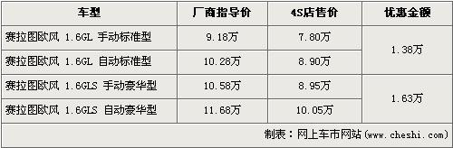 據(jù)經(jīng)銷商處銷售人員介紹,賽拉圖歐風全系最高出現(xiàn)了最高1.63萬元的優(yōu)惠。賽拉圖歐風在售的有4個車型,入門級的1.6L手動標準版的優(yōu)惠金額為1.38萬元,售價從廠商指導價9.18萬元降到7.80萬元,1.6L豪華版的手動版和自動版車型都經(jīng)全系最高1.63萬元優(yōu)惠后,售價分別降至8.95萬元和10.05萬元。
