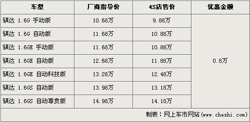 據東風日產4s店銷售人員介紹,目前東風日產騏達全系優惠9000元。經優惠后,入門級的1.6G手動版售價下降到了9.88萬元,而全系最高配的1.6 GS自動尊貴版售價也降到了14.18萬元。銷售人員還介紹,目前店內沒有騏達現車,欲購買者需交2000元訂金約等1個月時間。