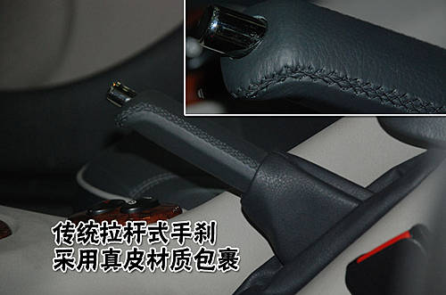 名爵MG 7L采用傳統(tǒng)的拉桿式手剎,表面材料為塑料,行程較短,表面采用真皮材料縫制,手感比較舒服。