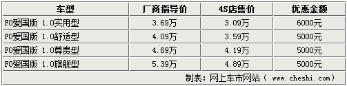 據比亞迪汽車4S店銷售人員介紹,比亞迪F0愛國版igo系列車型的現車并不是很齊全,實用型和舒適型都有現車,尊貴型和旗艦型則需要預訂,大概10-15天即可提車。而目前1.0L實用型和舒適型都有現車,其中實用型可以優惠6000元,優惠后售價已經接近3萬;而其他車型只可以優惠5000元現金。