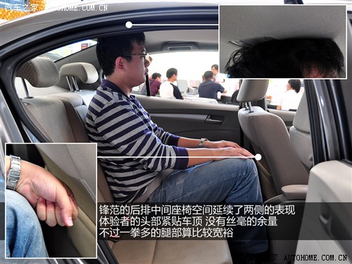 得益于較長(zhǎng)的軸距,鋒范在內(nèi)部縱向空間上的表現(xiàn)的確出色。但由于前排座椅設(shè)計(jì)的更為厚實(shí)一些,因此體驗(yàn)者的腿部空間依然是和飛度上相同的兩拳。即便是換坐到中間座位,腿部依然有較出色的一拳多。此外鋒范的后排地板和飛度一樣屬于略有凸起但不影響舒適性的范疇。不過鋒范在內(nèi)部垂直空間的表現(xiàn)上實(shí)難令人滿意,雖然車頂有為爭(zhēng)取更多頭部空間而設(shè)計(jì)的內(nèi)凹造型,但實(shí)際效果不明顯。總之坐在鋒范內(nèi),體驗(yàn)者的頭部壓抑和不適感十分明顯。