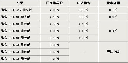 據吉利汽車4S店銷售人員介紹,吉利熊貓近期有最高4000元的優惠。新推出的1.0L車型優惠為1000元,售價降到了3.98萬元。1.3L手動功夫版優惠3000元,售價降到了3.88萬元,其他手動擋車型優惠4000元。由于熊貓1.3L自動檔車型尾氣排放不合格,所以無法在北京上牌照。銷售人員還介紹,目前1.0L車型較緊張,1.3L車型現車充足。