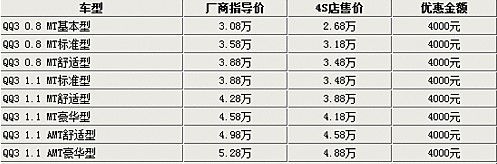 據奇瑞QQ3專營店銷售人員介紹,奇瑞QQ3系列車型比較齊全,只有1.1AMT車型現車較少。但目前QQ3全系都有一定的優惠幅度,除現車較少的車型需要提前預訂以外,全系車型均可以優惠4000元。