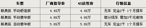 據長安鈴木北京地區4S店銷售人員介紹,目前新奧拓銷售火爆,只有手動豪華版有現車,以藍色、白色、金色為主,提車需要在4S店加裝3000元裝飾。其余車型及顏色需要預訂,定金為2000元,最快1個月可提車。北京地區各4S店由于訂單不同,各店銷售的現車顏色有所不同。