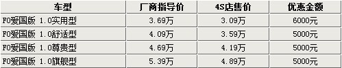 據比亞迪汽車4S店銷售人員介紹,比亞迪F0愛國版igo系列車型的現車并不是很齊全,實用型和舒適型都有現車,尊貴型和旗艦型則需要預訂,大概10-15天即可提車。而目前1.0L實用型和舒適型都有現車,其中實用型可以優惠6000元,優惠后售價已經接近3萬;而其他車型只可以優惠5000元現金。