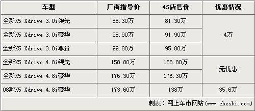 據(jù)經(jīng)銷商處銷售人員介紹,店內(nèi)還有一輛售價為173.6萬元的08款X5 4.8i豪華版現(xiàn)車,目前此批車有35.6萬元的優(yōu)惠,經(jīng)優(yōu)惠后售價降到了138萬元。銷售人員還介紹,新款X5-30i車型有4萬元的優(yōu)惠,4.8i車型沒有優(yōu)惠。