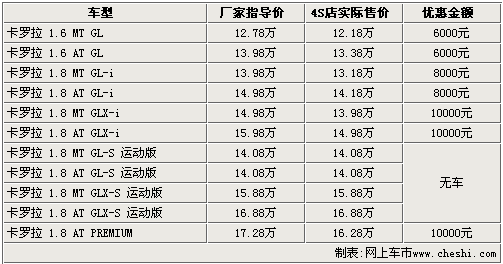 據一汽豐田4S店銷售人員介紹:目前2.0L排量的運動版車型無現車銷售,購買其他車型則可以享受到8000元——10000元的現金優惠。入門級的1.6 MT GL版車型售價降到了12.18萬元,高配的1.8 AT PREMIUM版經10000元優惠后,售價也降到了16.28萬元。
