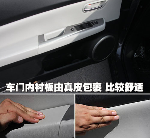 車門內(nèi)襯板由真皮包覆,材質(zhì)比較柔軟,駕車時(shí)或長(zhǎng)途駕駛,喜歡把胳膊放在車門邊的朋友都會(huì)感到比較舒適。