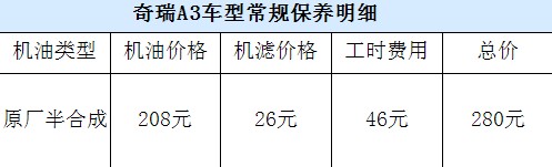 或許有人會想,采用自主研發(fā)發(fā)動機(jī)的奇瑞A3車型的保養(yǎng)費(fèi)用上應(yīng)該比較便宜吧!其實不然,由于奇瑞4S店為奇瑞A3車型標(biāo)配的是美孚速霸1000半合成機(jī)油,因此材料費(fèi)比較高,計算下來更換機(jī)油機(jī)濾總共需要花280元左右。而奇瑞A3享受兩次的免費(fèi)保養(yǎng)檢測,第一次為2000公里時的免費(fèi)檢測以及油液補(bǔ)充,第二次是5000公里的機(jī)油機(jī)濾的更換。