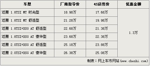 據北京一汽大眾經銷店銷售人員介紹,邁騰全系車型全系優惠1.3萬元。經1.3萬元的優惠后,全系入門級的1.8TSI MT時尚型的售價從18.98萬元下降到了17.68萬元。全系最高配的邁騰2.0TSI豪華版經1.3萬元優惠后,售價降到了25.08萬元。銷售人員還介紹,目前邁騰全系現車都比較充足。