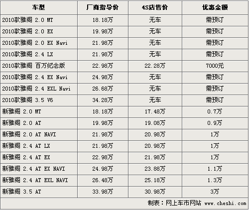 據(jù)4S店銷(xiāo)售人員介紹,目前部分2010款百萬(wàn)紀(jì)念版雅閣新車(chē)已經(jīng)到店,消費(fèi)者購(gòu)車(chē)的話(huà)可以?xún)?yōu)惠7000元。其他款車(chē)型還需要預(yù)訂,訂金為2000元。現(xiàn)在店內(nèi)08款車(chē)型最高可優(yōu)惠現(xiàn)金3萬(wàn)元,入門(mén)級(jí)車(chē)型優(yōu)惠現(xiàn)金7000元,以2.0手動(dòng)檔為例,優(yōu)惠后僅首17.49萬(wàn)。現(xiàn)在店內(nèi)有黑色、銀色等可供消費(fèi)者選擇。