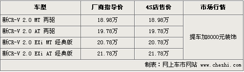 新CR-V全系7款車型有四款2.0排量車型。據東風本田北京地區4S店銷售人員介紹,目前CR-V加價繼續降低,但現在提現車還需加裝8千元的裝飾,裝飾項目包括了腳墊、尾翼、行李架、踏板等。消費者可根據需求選購,但是消費金額必須達到8千元。目前有黑色、銀色現車供應,白色車型比較緊張,需要預訂,訂金為2萬元,最快年底前可以提到車。北京地區各4S店由于訂單不同,各店銷售的現車顏色有所不同。