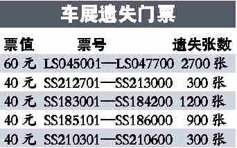 這5400張車展門票是在19日晚間遺失的,車展主辦方已經報案。涉及面值分別有60元和40元兩種,各有2700張。