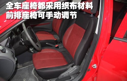 海馬丘比特的全車座椅都采用織布材料,但大部門面料都采用紅色織網樣式,使整車看上去運動氣息十足,而且座椅兩側對身體的包括也比較到位。前排座椅采用手動調節方式,但不能夠高低調節。