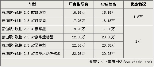據4S店銷售人員介紹:在售的蒙迪歐-致勝共有6款車型,近期購買的消費者最高可以得到2萬元的優惠。入門級的2.0L手動舒適版以及2.3L自動時尚版經1.8萬元的優惠后,售價分別降為了15.18萬元和16.18萬元。2.3L豪華運動版、至尊版以及豪華運動導航版經全系最高的2萬元優惠后,售價分別降為了20.38萬、20.68萬以及20.98萬元。