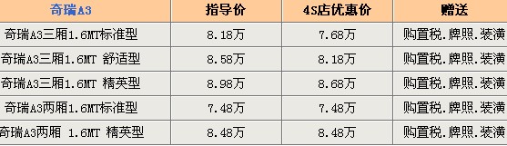 全新的2010款奇瑞A3于近日正式上市,全系均添加了ESP并在內(nèi)外裝飾上有了更多的亮點(diǎn)。筆者從奇瑞汽車經(jīng)銷商了解到,2010款A(yù)3目前現(xiàn)車很少,現(xiàn)在預(yù)訂要等到明年1月初提車,目前價(jià)格上沒有優(yōu)惠。不過店內(nèi)還有部分老款庫存車型,其中三廂車型在享受最高5000元優(yōu)惠的同時(shí)還可贈(zèng)送多重優(yōu)惠,包括送全額購置稅,價(jià)值3000元左右的外牌以及國產(chǎn)全車貼膜、倒車?yán)走_(dá)裝潢等等,禮包實(shí)惠價(jià)值超過了8000元。