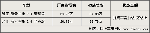 據進口起亞4S店銷售人員介紹,新索蘭托近日到達一批新車,但銷售較快,所以現車情況還是非常緊俏,預訂訂單已經排到明年5月份,需交訂金1萬元。如果消費者急于提現車的話,需要在店內加裝2萬元裝飾,裝飾包括:腳墊、貼膜、地膠、封釉、加不銹鋼保險杠等。現車顏色以黑色、銀色、灰色為主。