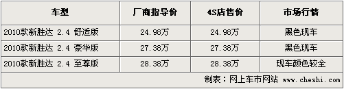 據(jù)現(xiàn)代汽車4S店銷售人員介紹,2010款新勝達(dá)目前至尊版現(xiàn)車較全,現(xiàn)車顏色有黑色、白色、銀色、藍(lán)色、銅色可供選擇,其余兩款車型有黑色現(xiàn)車供應(yīng),如需預(yù)訂其他顏色需交訂金1萬元,等待15天左右可提到車。北京地區(qū)各4S店由于訂單不同,各店銷售的現(xiàn)車顏色有所不同。