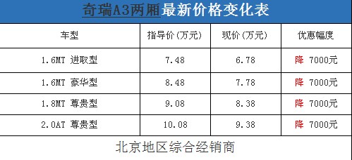 近日,編輯從北京地區綜合經銷商處了解到,奇瑞A3的現車充足,顏色也比較齊全,提供給消費者的選擇空間較大;目前購買該車全系都可以優惠7000元現金,與之前的降價幅度相比有了小幅度的提升,性價比很不錯。據經銷商透露,消費者要想以這個價格購車,需要在店內做一條龍服務,其中車輛四項基本險最低可以打7折(約合2500-3000元左右)。以下是奇瑞A3最新價格變化表: