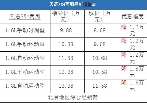 近日,編輯從北京地區(qū)長(zhǎng)安鈴木綜合經(jīng)銷商處了解到,天語(yǔ)SX4兩廂有黑色和紅色現(xiàn)車,目前購(gòu)車最高有1.8萬(wàn)元的現(xiàn)金優(yōu)惠,并且贈(zèng)送汽車裝飾,性價(jià)比非常不錯(cuò)。據(jù)經(jīng)銷商透露,消費(fèi)者想要以這個(gè)價(jià)格提車,需要在店內(nèi)做一條龍服務(wù),其中車輛四項(xiàng)基本保險(xiǎn)可以打8.5折(約合3500-4100元左右)。以下是天語(yǔ)SX4最新價(jià)格變化表: