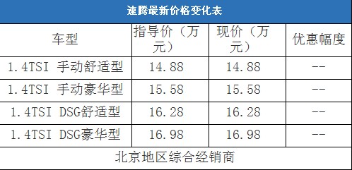 近日,編輯從北京地區一汽-大眾4S經銷商處了解到,速騰1.4TSI有少量現車,但是在4S經銷商處購車均需要加裝5000-1.2萬元的汽車裝飾(價值3000元左右的基本裝飾),經銷商表示這種加裝方式不能折合成現金。相比之下,速騰1.4TSI車型在綜合經銷商處的性價比要高一些,雖然沒有任何現金優惠,但是不用加價提車,也不需要加裝汽車裝飾。據綜合經銷商透露,消費者要想以這個價格提車,要在店內做一條龍服務才可以,其中車輛四項基本保險可以打9折。以下是速騰1.4T最新價格變化表: