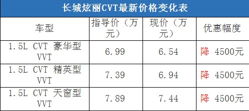 近日,編輯從北京地區綜合經銷商處了解到,購買長城炫麗CVT車型有4500元的現金優惠,店內有黑色現車在售,部分車型預定等待10天左右就可以提車。據經銷商透露,消費者要想以這個價格提車,需要在店內做購車一條龍服務,其中車輛四項基本保險可以打8折(約合2800-2900元左右)。以下是長城炫麗CVT最新價格變化表: