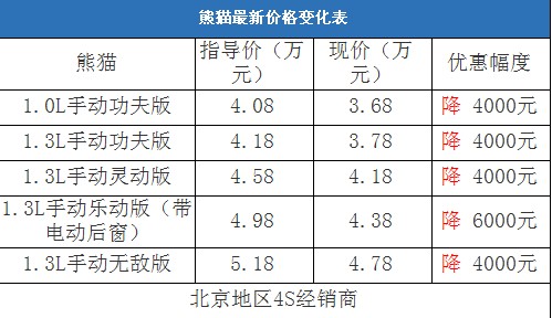 比新奧拓超值,熊貓最低跌入3萬區間