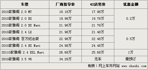 據廣汽本田4S店銷售人員介紹,目前雅閣全系現車供應依然比較緊張,只有部分車型有少量現車。其中2.0排量全系優惠僅在2000元左右,個別店甚至沒有優惠,2.4排量除百萬紀念版、EX導航版有少量現車之外,其它款均需要預訂,現車優惠幅度也在5千元-1萬元之間。目前訂車的話,最少也需要等1個月左右時間,訂金為5000元。