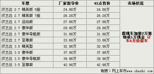 據廣汽豐田4S店銷售人員介紹,國產漢蘭達自上市以來持續熱銷,目前漢蘭達現貨非常緊張,如果消費者急于提現車的話,需要在店內加裝2萬元的汽車裝飾或加價1萬元現金。如預訂則需要到今年6月份才能提到車,訂金為1萬元。北京地區各4S店由于訂單不同,各店銷售的現車顏色有所不同。