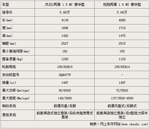 3月22日,動(dòng)感都市家轎――風(fēng)云2兩廂 “鯨”艷登場(chǎng),此次上市的風(fēng)云2兩廂,實(shí)力型,售價(jià)5.18萬(wàn)元;進(jìn)取型,售價(jià)5.58萬(wàn)元,豪華型,售價(jià)5.88萬(wàn)元,尊貴型,售價(jià)6.08萬(wàn)元,共有魅力橙、炫金黃、靈動(dòng)灰、閃電銀、活力藍(lán)、激情紅等六種顏色。那么這款小車的競(jìng)爭(zhēng)如何呢?我們選擇與豪華價(jià)位接近的悅翔兩廂手動(dòng)豪華型,來(lái)看看風(fēng)云2到底怎樣,希望能為您購(gòu)車提供參考。