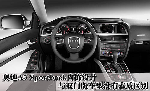 奧迪A5 Sportback四門轎跑車擁有與奧迪A系家族車型一致的內(nèi)飾設(shè)計(jì),最大的區(qū)別在于車廂布局上。銀白色的金屬裝飾條和黑色防反光儀表板,突出時(shí)尚與動(dòng)感的視覺(jué)效果,甚至在車頂和座椅的色彩選擇上都采用了冷酷的黑色。