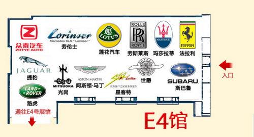 在本屆北京車展,E4館有斯巴魯、法拉利、瑪莎拉蒂、捷豹、路虎、蓮花、阿斯頓·馬丁、勞斯萊斯、世爵、光崗以及眾泰等13個品牌參展,主要亮點車型包括斯巴魯HYBRID TOURER概念車、法拉利599 GTO、法拉利458 Italia、瑪莎拉蒂GranCabrio、全新捷豹XJ以及勞斯萊斯Ghost等。