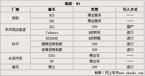 在W3館中,共有7家汽車廠商在此參展,除雪鐵龍/東風雪鐵龍和開瑞外,其余廠商如標致將帶來兩款概念車RCZ和SR1;東風悅達起亞將帶來即將國產的SUV車型——SLC(海外版新獅跑)和以進口方式引入的新中級車——Cadenza,鈴木將在本屆車展中帶來三款車型,其中新款轎跑車KAZASHI是最大的亮點。自主品牌也不甘寂寞,長安汽車和海馬汽車分別帶來了C201概念車和SUV車型——騎士。