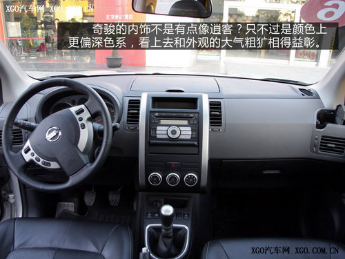 奇駿的內飾設計與逍客有不少相似之處,只是為了迎合硬朗的外形,車內使用了深色系的顏色搭配,并在細節設計上更多的選擇了方形,看上去更簡潔大氣。而且在用料做工上,也比CR-V要厚道一些。