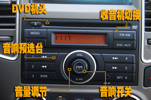 東風日產新軒逸高配車型配備6碟CD播放器。值得一提的是新軒逸全系高配車型還可讀DVD格式的光盤。音響按鍵分布合理,按鍵面積較大,十分便于駕駛員和乘客操作。